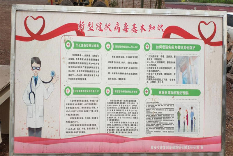 一是創(chuàng)新宣傳形式,利用公司QQ群、微信群、推送《中華人民共和國傳染病防治法》、《四川省應對新冠肺炎疫情分區(qū)分級差異化防控指南(第二版)》、《雅安市新型冠狀病毒肺炎疫情防控工作要點指引》等法律法規(guī),每日持續(xù)有效的傳播疫情防控的信息,加大健康教育宣傳,引導職工不信謠不傳謠,營造良好的輿論環(huán)境。二是落實責任主體,在公司、各項目部張貼疫情防控法制宣傳展板、懸掛宣傳橫幅、發(fā)放防控宣傳冊,設(shè)立疫情防控教育專欄,向項目參建人員宣講疫情防控知識,做好疫情群防群治工作,營造濃厚的防控宣傳氛圍。三是精準發(fā)力,組織已進場勞務(wù)人員開展疫情防控及復工復產(chǎn)安全教育培訓,確保項目復工復產(chǎn)和疫情防控工作有序推進。