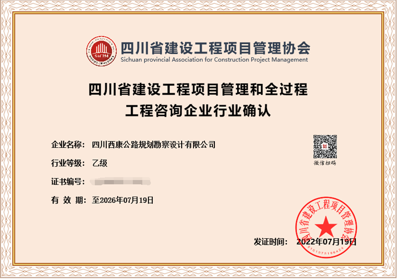 日前,經(jīng)四川省建設工程項目管理協(xié)會評審,交建集團四川西康公路規(guī)劃勘察設計有限公司獲得“四川省建設工程項目管理和全過程工程咨詢企業(yè)行業(yè)乙級資格”確認,成為四川省內(nèi)為數(shù)不多獲得開展全過程項目管理和咨詢資質(zhì)企業(yè)之一。