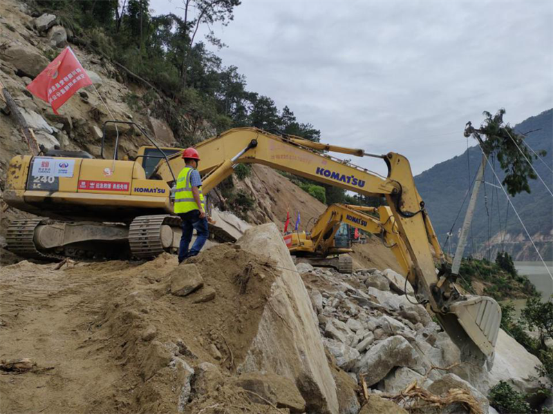 搶險隊伍,馬上出發(fā)!集團領導班子立即召開碰頭會,分析研判形勢,安排部署工作,密切關注震區(qū)態(tài)勢,成立抗震救災領導小組,副總經(jīng)理鐘焱宇率現(xiàn)場指揮組趕赴石棉靠前指揮搶險救災。正在石棉G108線施工的康藏路橋公司項目部組成10人搶險救援小分隊,攜帶挖掘機4臺、拖車4臺、裝載機3臺、交通運輸車2輛、無人機1臺,第一時間到就地搶險工作,震后7小時,完成國道G108線馬富至菩薩崗約40公里路段、6處塌方點1600余方土石方清理,爾后轉(zhuǎn)戰(zhàn)石棉縣新民鄉(xiāng)進行通鄉(xiāng)道路搶通作業(yè)。