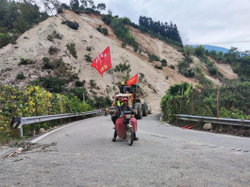 9月5日,項目經(jīng)理吳學林同志帶領突擊隊率先抵達G108線菩薩崗。一次次余震攔不住他們的腳步,一聲聲哀嚎更堅定了他們逆行的決心。在通訊受阻的情況下,緊急調配2臺挖掘機、1臺推土機自G108線又轉戰(zhàn)新民鄉(xiāng),在受災嚴重的X067縣道開展道路搶通以及救援工作。在搶險一線,飛石及塌方的風險時刻危及著救災人員的自身安全!耙欢ㄒ嘤^察!首先要保證自己的安全才能更好地完成搶險工作!”項目經(jīng)理吳學林同志、項目工程部副部長李健同志在轟鳴的搶險現(xiàn)場喊破嗓子指揮著各類機具搶險作業(yè)。待通訊恢復后,吳學林同志一邊組織現(xiàn)場搶險,一邊實時逐級上報受災和搶險情況,與第一時間趕來的集團公司和路橋公司現(xiàn)場指揮組,會商道路受阻情況,研究布置搶險保通工作。緊接著,石棉項目部搶險人員來不及片刻休息,馬不停蹄地投入到一處處塌方、受阻道路搶通中。