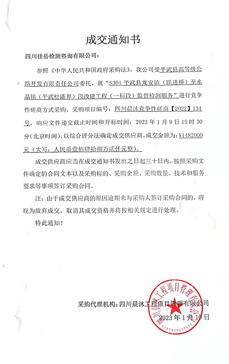 中標(biāo)項(xiàng)目為S301平武縣龍安鎮(zhèn)(躍進(jìn)橋)至水晶鎮(zhèn)(平武松潘界)段改建工程(一標(biāo)段)監(jiān)督檢測(cè)服務(wù)項(xiàng)目,成交金額148萬(wàn)余元。此次成功中標(biāo)展示了公司的檢測(cè)能力和市場(chǎng)競(jìng)爭(zhēng)力,為公司“走出去”積極承攬市外、省外業(yè)務(wù)增添信心。