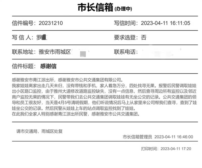 4月11日,雅安市公共交通集團有限公司收到來自市長信箱的一封感謝信,市民羅女士對公交集團熱心幫助自己成功找到離家出走的孩子表示深深的感謝。