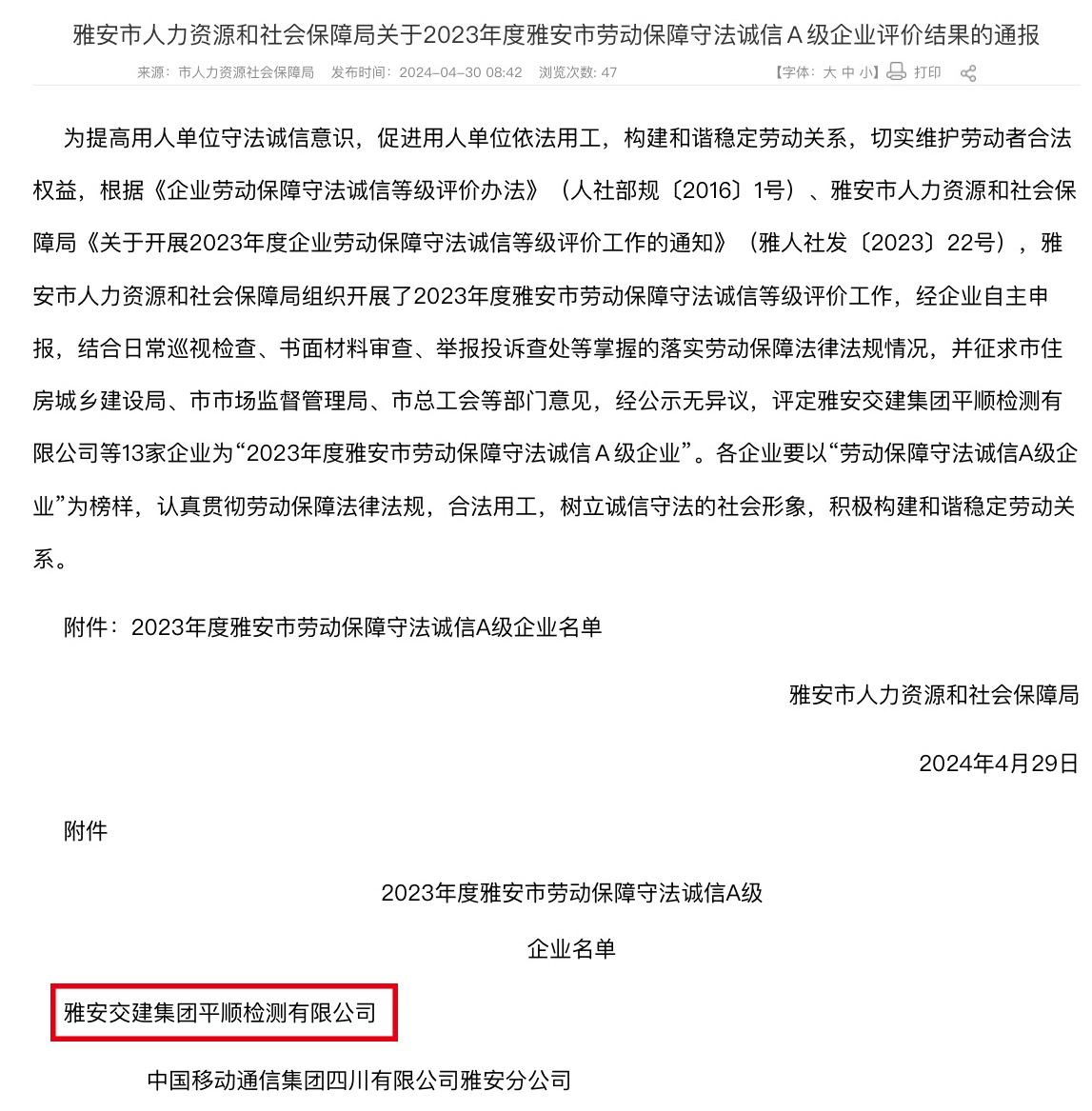 喜報(bào)!雅安交建集團(tuán)平順公司榮獲2023年度市級(jí)勞動(dòng)保障守法誠(chéng)信A級(jí)企業(yè)