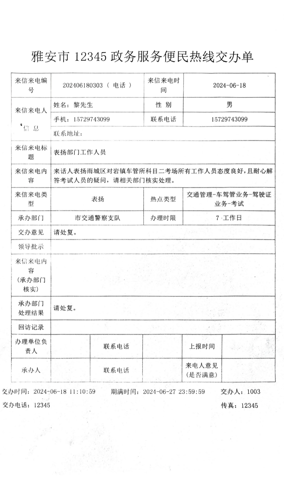 2024年6月18日,平順公司收到一封特殊的來(lái)信,市民黎先生通過(guò)“12345”政務(wù)服務(wù)便民熱線“...表?yè)P(yáng)科目二考場(chǎng)所有工作人員態(tài)度良好,且耐心解答考試人員的疑問(wèn)...”。字里行間表達(dá)了對(duì)我公司科目二所有工作人員工作的滿意和認(rèn)可。