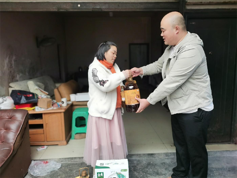 10月18日下午,雅安交建集團運通貿(mào)易有限公司黨員干部在雨城區(qū)青江街道石馬社區(qū)工作人員的帶領(lǐng)下,前往“一對一”幫扶對象黃非女士家中,為她送去了大米、食用油、牛奶等慰問品。