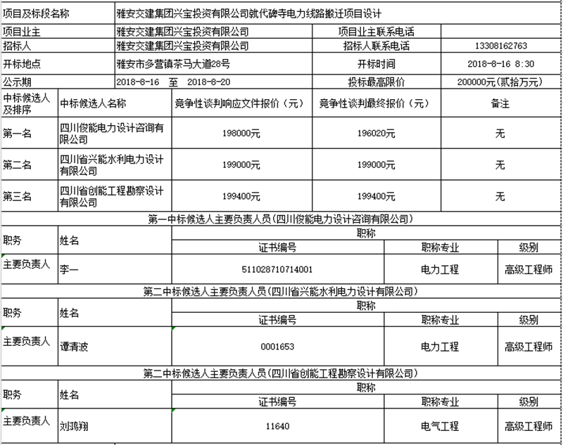 雅安交建集團興寶投資有限公司就代碑寺電力線路搬遷項目設(shè)計競爭性談判中標候選人公示