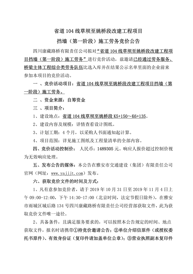 四川康藏路橋有限責(zé)任公司省道104線草壩至姚橋段改建工程項目擋墻(第一階段)施工勞務(wù)競價公告