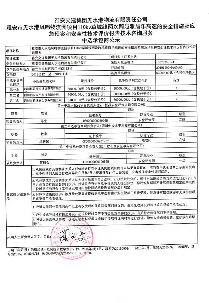 雅安交建集團無水港物流有限責任公司雅安市無水港鳳鳴物流園項目110kv草城線兩次跨越雅眉樂高速的安全措施、應急預案以及安全性技術評價報告技術咨詢服務中選承包商公示