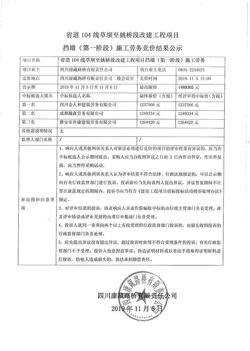 四川康藏路橋有限責(zé)任公司省道104線草壩至姚橋段改建工程項(xiàng)目擋墻(第一階段)施工勞務(wù)競(jìng)價(jià)結(jié)果公示