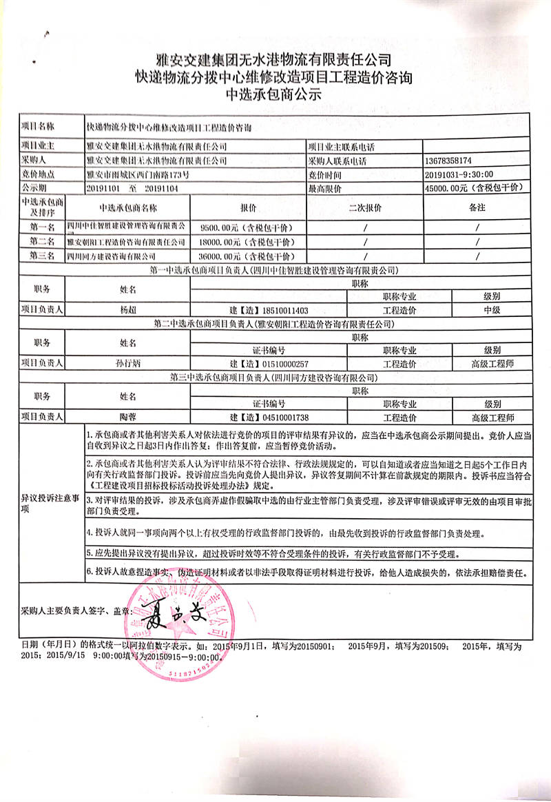 雅安交建集團(tuán)無水港物流有限責(zé)任公司快遞物流分撥中心維修改造項(xiàng)目工程造價(jià)咨詢中選承包商公示