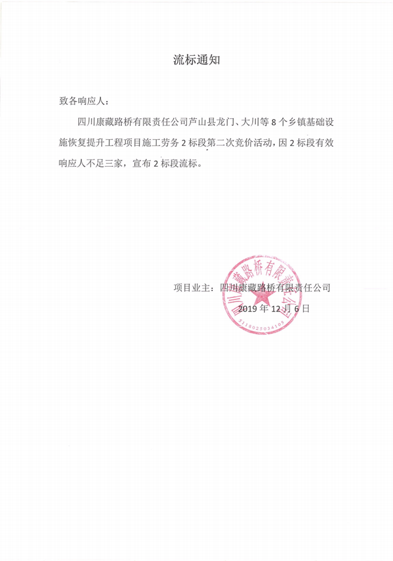 四川康藏路橋有限責(zé)任公司蘆山縣龍門、大川等8個(gè)鄉(xiāng)鎮(zhèn)基礎(chǔ)設(shè)施恢復(fù)提升工程項(xiàng)目施工勞務(wù)2標(biāo)段第二次競價(jià)流標(biāo)通知