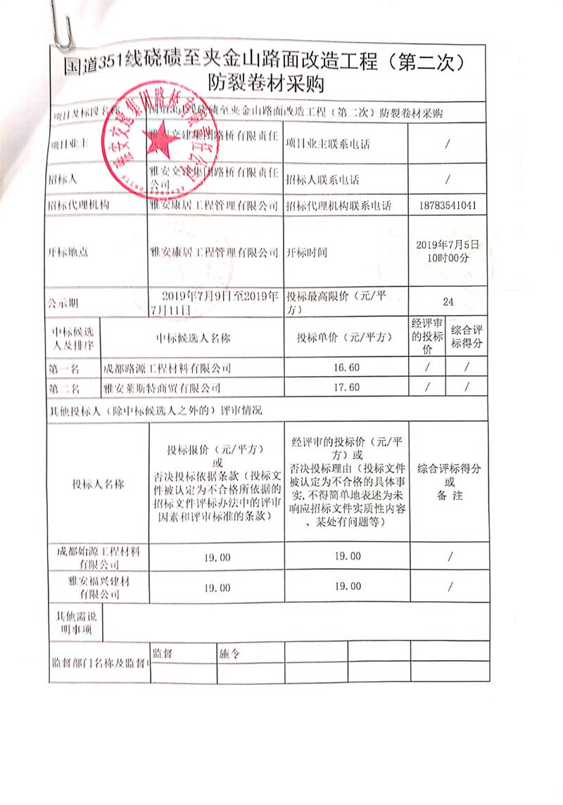 雅安交建集團路橋有限責任公司國道351線磽磧至夾金山路面改造工程(第二次)防裂卷材采購競爭性談判結(jié)果公示
