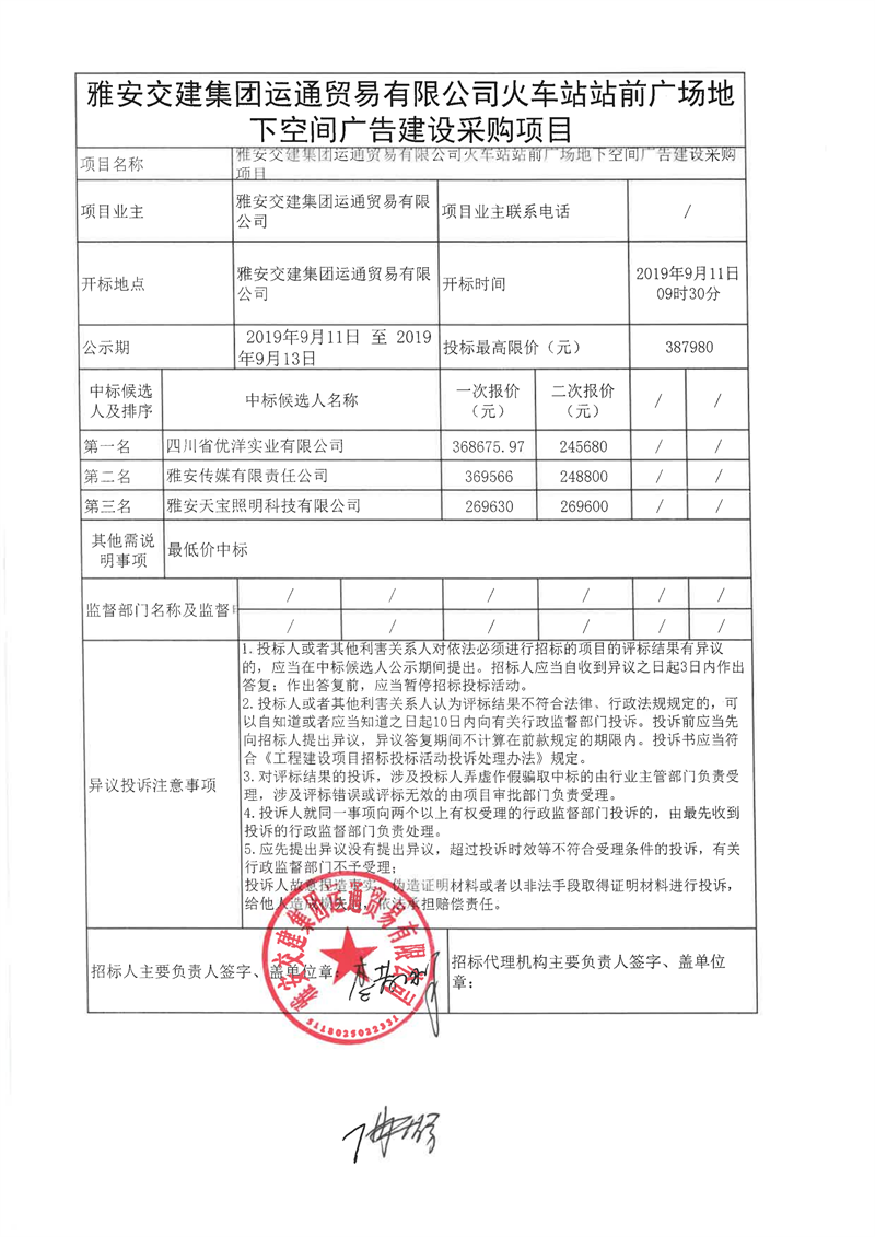 雅安交建集團(tuán)運(yùn)通貿(mào)易有限公司火車(chē)站站前廣場(chǎng)地下空間廣告建設(shè)采購(gòu)項(xiàng)目結(jié)果公示