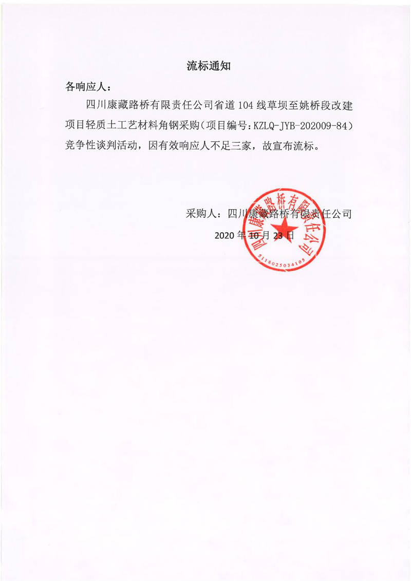 四川康藏路橋有限責(zé)任公司省道104線(xiàn)草壩至姚橋段改建項(xiàng)目輕質(zhì)土工藝材角鋼采購(gòu)項(xiàng)目流標(biāo)通知