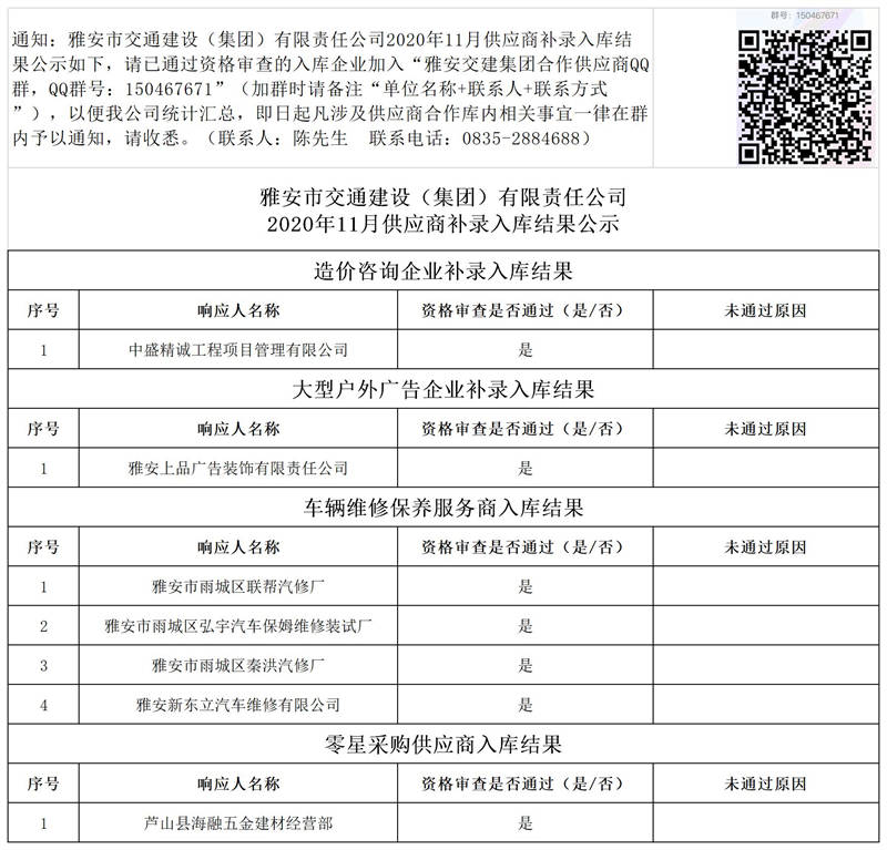 雅安市交通建設(shè)(集團(tuán))有限責(zé)任公司2020年11月供應(yīng)商補(bǔ)錄入庫(kù)結(jié)果公示