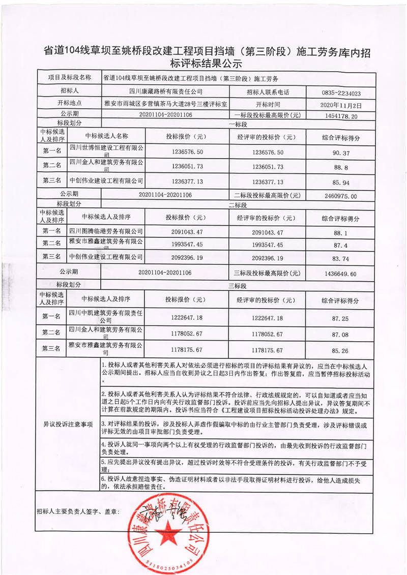 四川康藏路橋有限責(zé)任公司省道104線草壩至姚橋段改建工程項目擋墻(第三階段)施工勞務(wù)庫內(nèi)招標(biāo)評標(biāo)結(jié)果公示