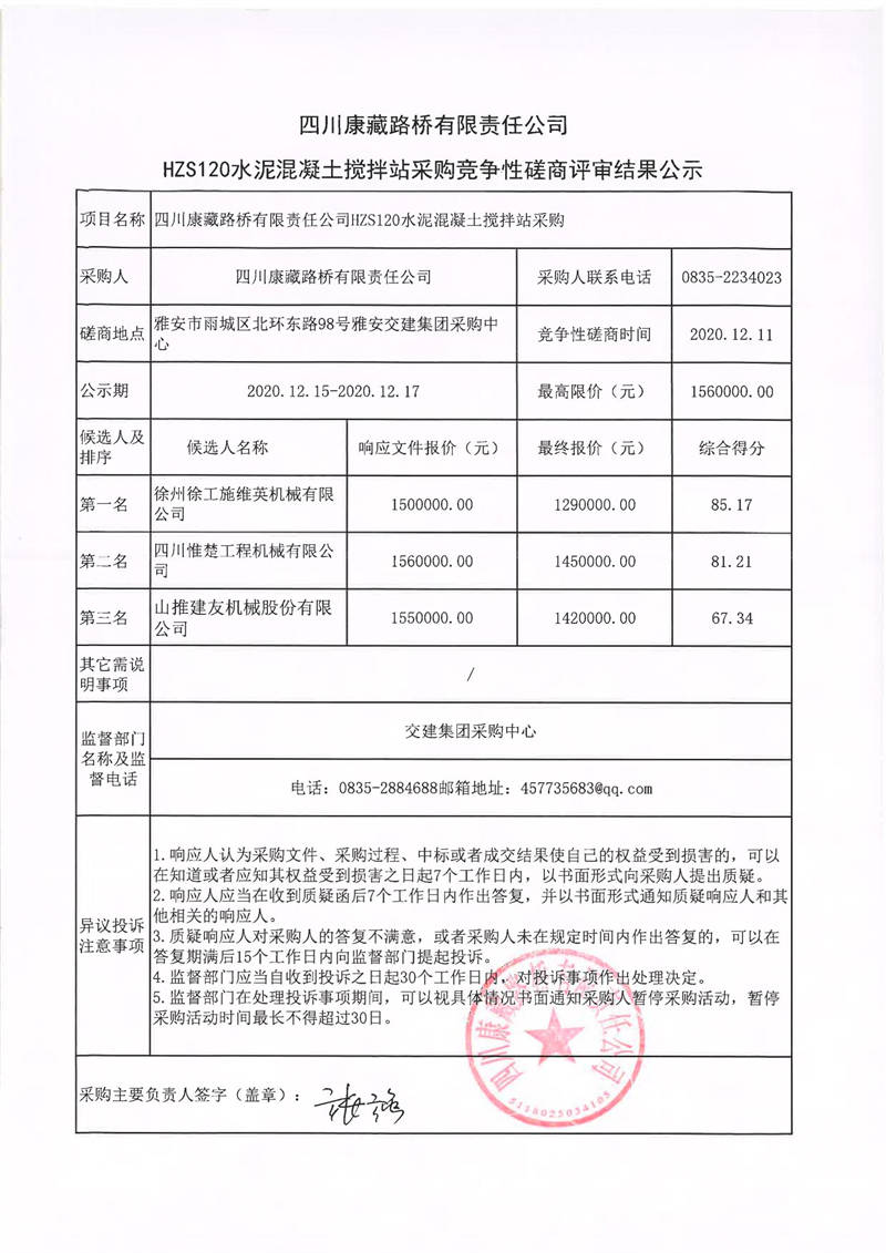 四川康藏路橋有限責(zé)任公司HZS120水泥混凝土攪拌站采購(gòu)競(jìng)爭(zhēng)性磋商結(jié)果公示