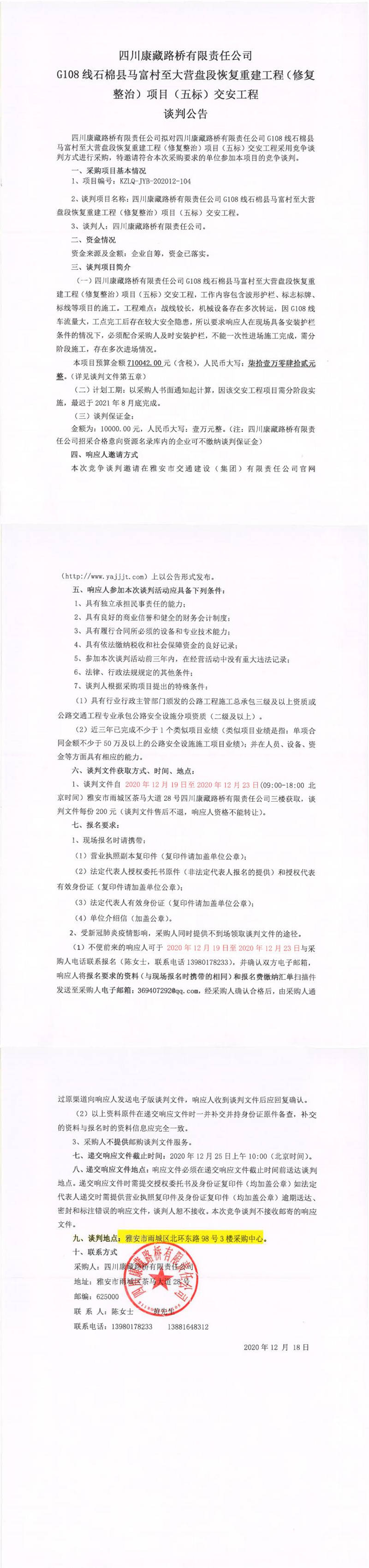 四川康藏路橋有限責任公司G108線石棉縣馬富村至大營盤段恢復重建工程(修復整治)項目(五標)交安工程談判公告