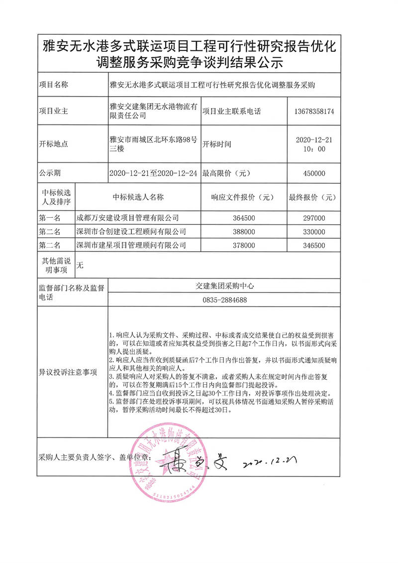 雅安交建集團(tuán)無水港物流有限責(zé)任公司雅安無水港多式聯(lián)運(yùn)項(xiàng)目工程可行性研究報告優(yōu)化調(diào)整服務(wù)采購競爭談判結(jié)果公示