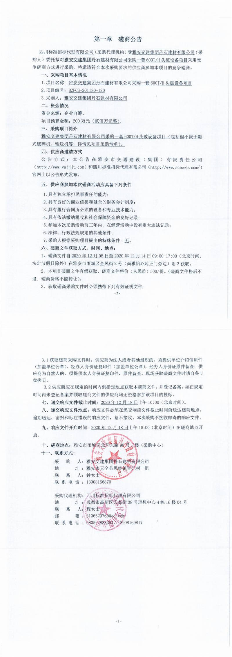 雅安交建集團(tuán)丹石建材有限公司采購(gòu)一套600T/H頭破設(shè)備項(xiàng)目磋商公告