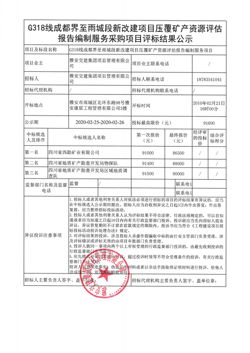 雅安交建集團項目管理有限公司G318線成都界至雨城段新改建項目壓覆礦產(chǎn)資源評估報告編制服務(wù)采購項目評標結(jié)果公示
