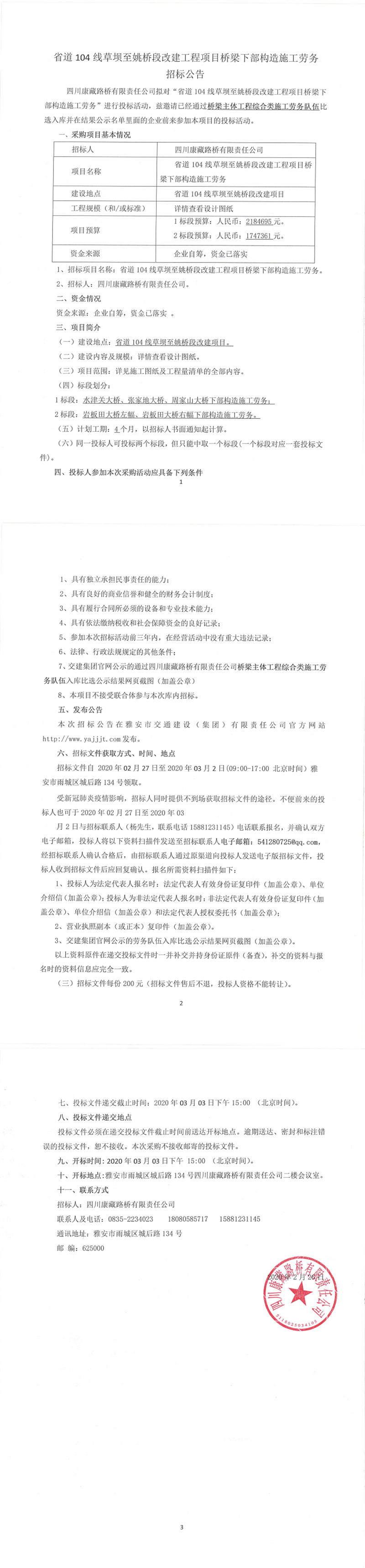 四川康藏路橋有限責(zé)任公司省道104線草壩至姚橋段改建工程項目橋梁下部構(gòu)造施工勞務(wù)招標公告