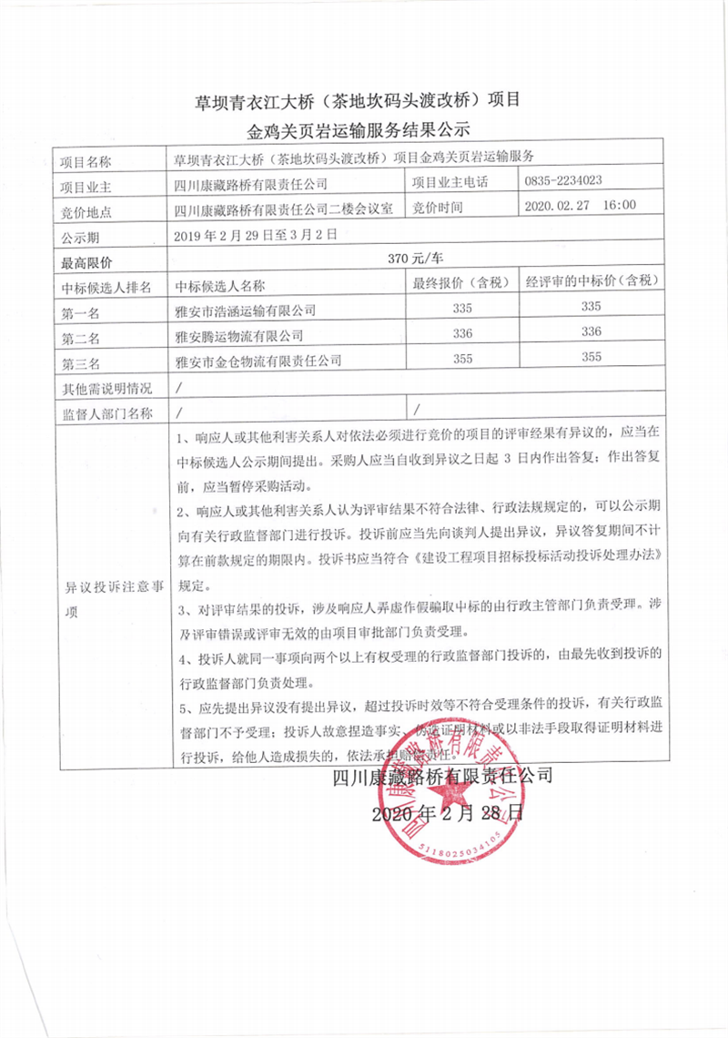 四川康藏路橋有限責任公司草壩青衣江大橋(茶地坎碼頭渡改橋)項目金雞關頁巖運輸服務結果公示