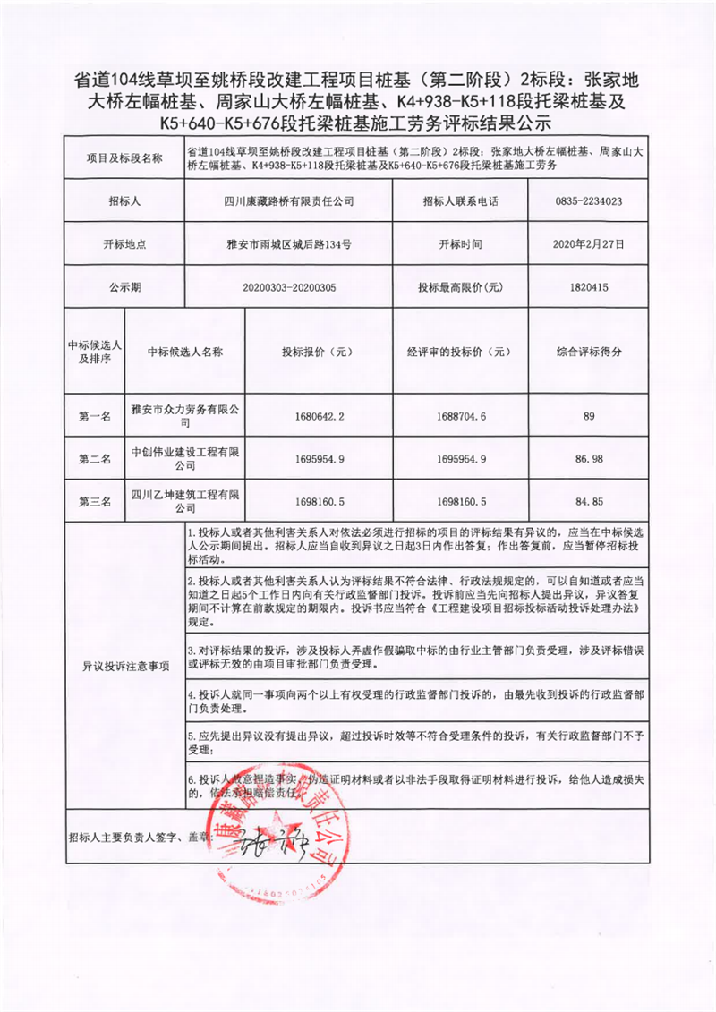 四川康藏路橋有限責(zé)任公司省道104線草壩至姚橋段改建工程項(xiàng)目樁基(第二階段)2標(biāo)段:張家地大橋左幅樁基、周家山大橋左幅樁基、K4+938-K5+118段托梁樁基及K5+640-K5+676段托梁樁基施工勞務(wù)評標(biāo)結(jié)果公示