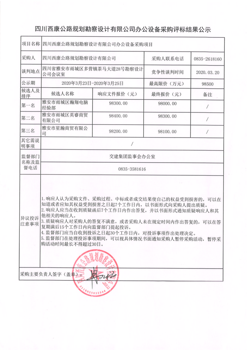 四川西康公路規(guī)劃勘察設計有限公司辦公設備采購評標結果公示