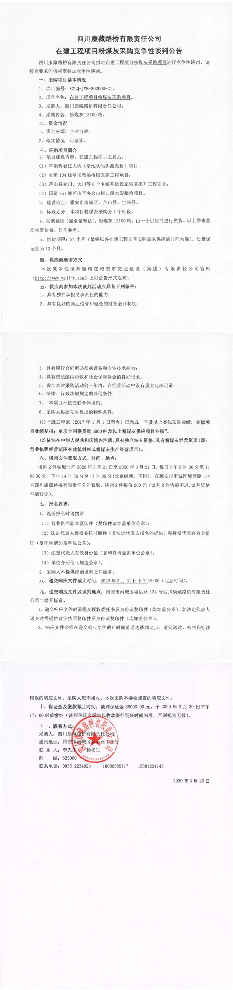 四川康藏路橋有限責(zé)任公司在建工程項(xiàng)目粉煤灰采購競爭性談判公告