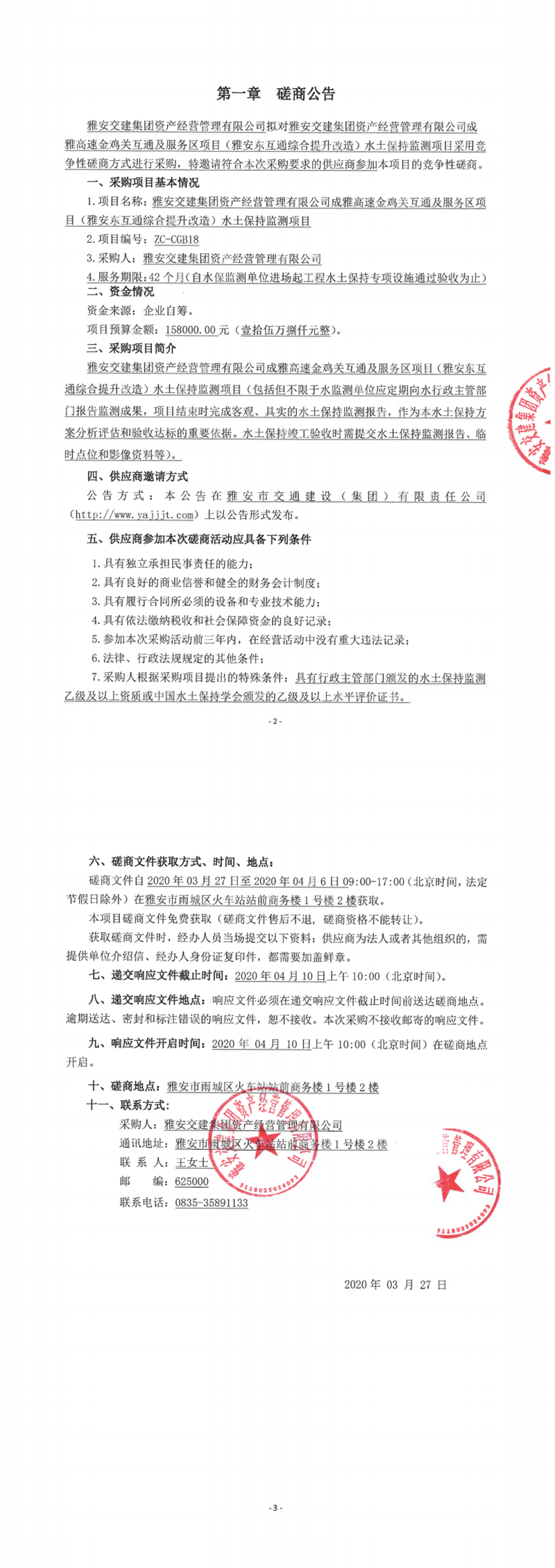 雅安交建集團資產(chǎn)經(jīng)營管理有限公司成雅高速金雞關互通及服務區(qū)項目(雅安東互通綜合提升改造)水土保持監(jiān)測項目競爭性磋商公告