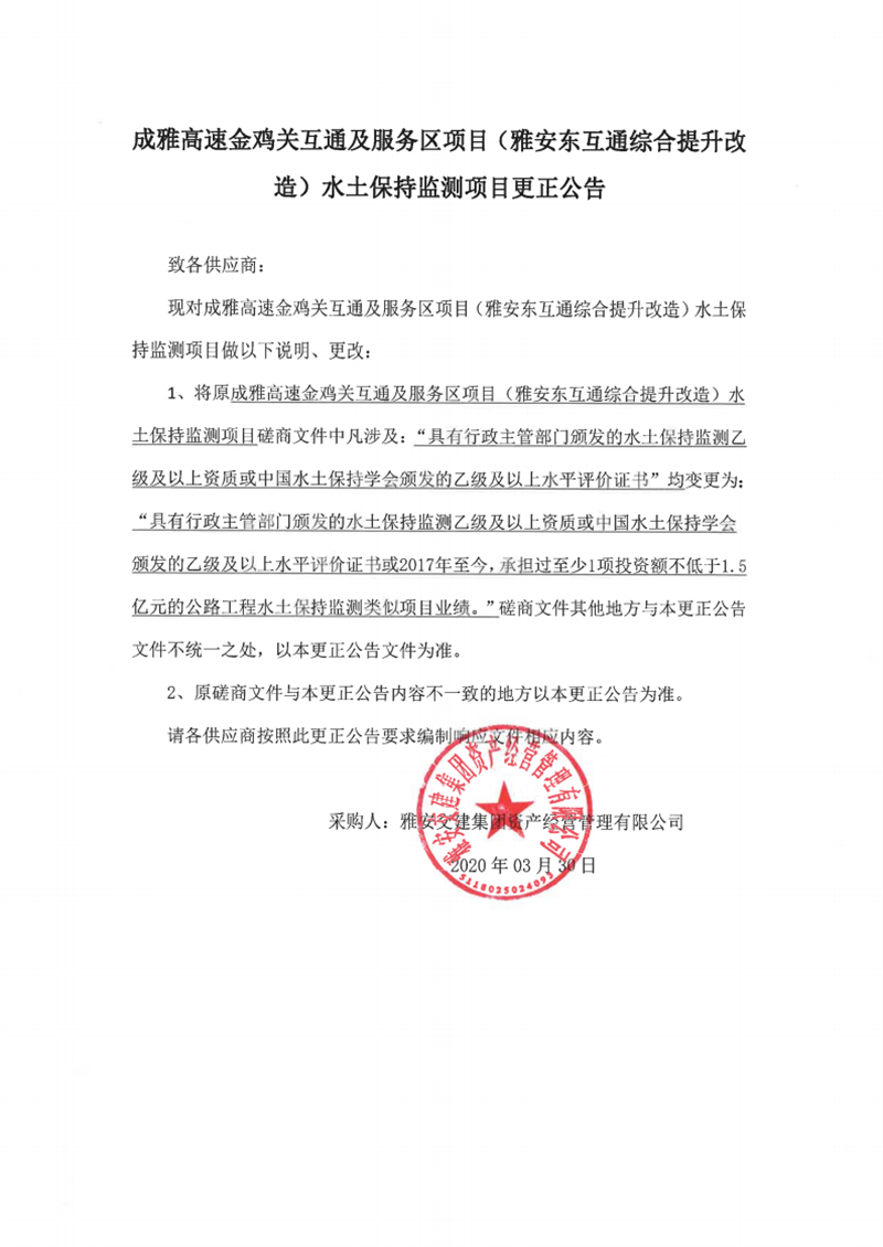 雅安交建集團(tuán)資產(chǎn)經(jīng)營管理有限公司成雅高速金雞關(guān)互通及服務(wù)區(qū)項(xiàng)目(雅安東互通綜合提升改造)水土保持監(jiān)測項(xiàng)目更正公告