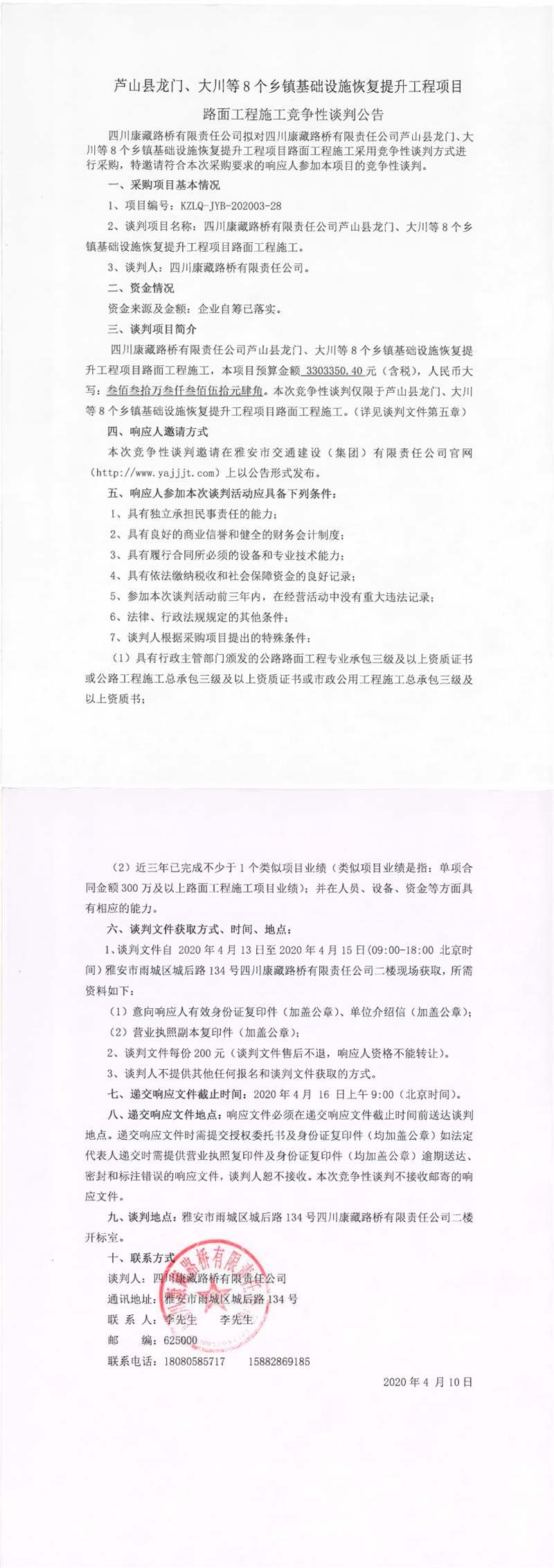 四川康藏路橋有限責(zé)任公司蘆山縣龍門、大川等8個(gè)鄉(xiāng)鎮(zhèn)基礎(chǔ)設(shè)施恢復(fù)提升工程項(xiàng)目路面工程施工競(jìng)爭(zhēng)性談判公告