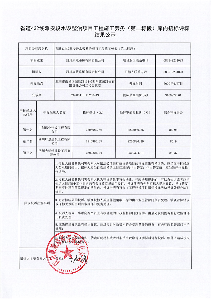 四川康藏路橋有限責任公司省道432線雅安段水毀整治項目工程施工勞務(wù)(第二標段)庫內(nèi)招標評標結(jié)果公示
