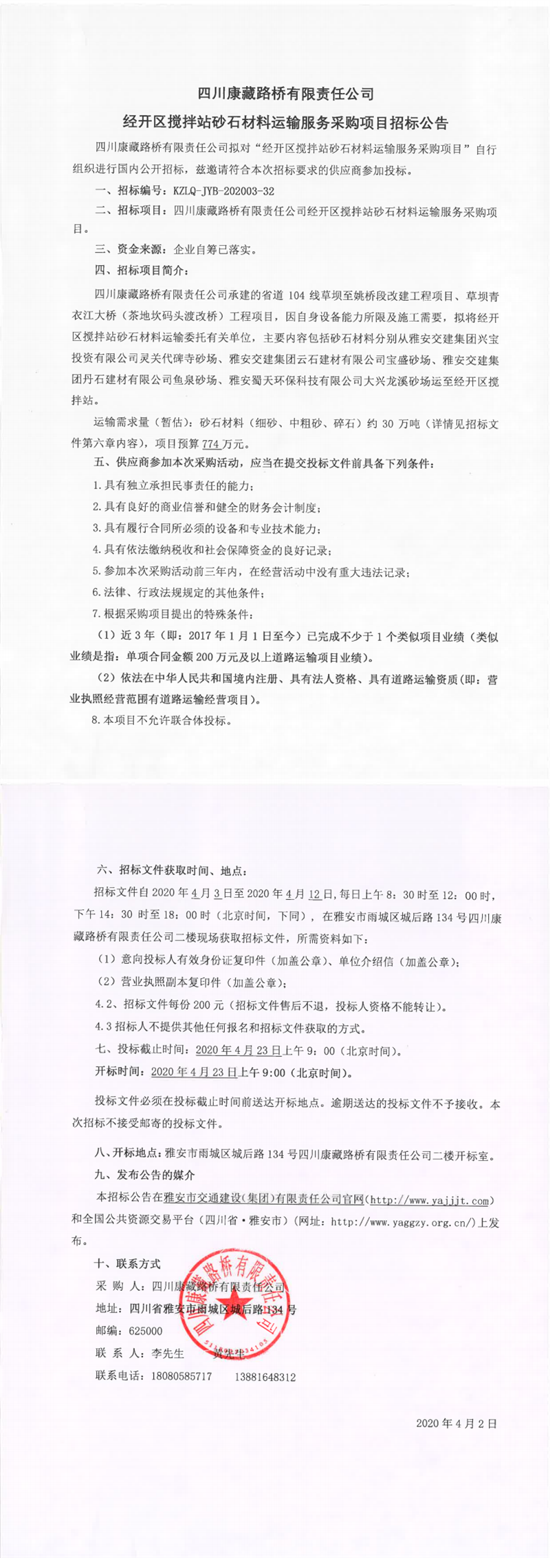 四川康藏路橋有限責(zé)任公司經(jīng)開區(qū)攪拌站砂石材料運(yùn)輸服務(wù)采購(gòu)項(xiàng)目招標(biāo)公告