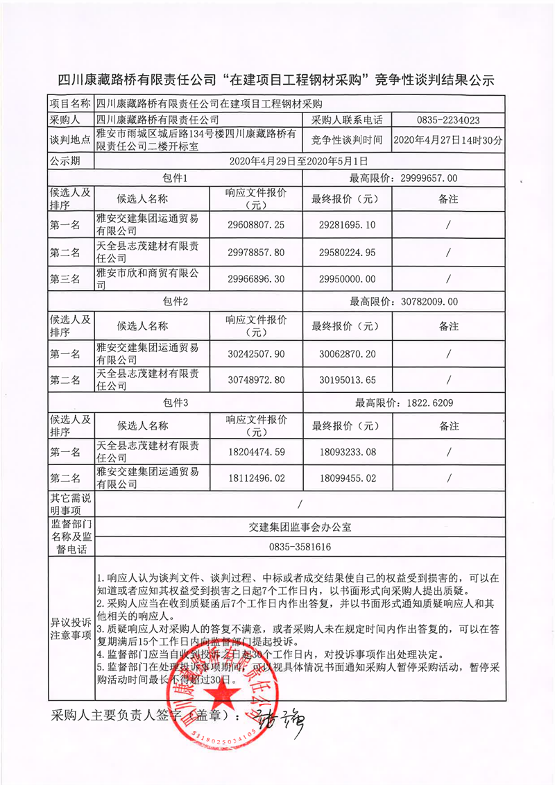 四川康藏路橋有限責(zé)任公司“在建項(xiàng)目工程鋼材采購”競爭性談判結(jié)果公示