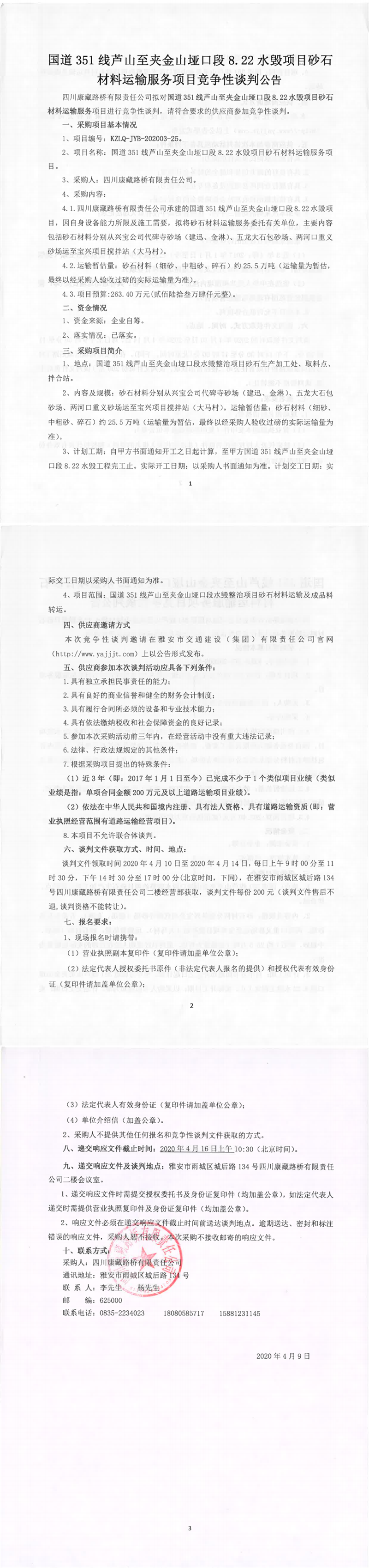 四川康藏路橋有限責(zé)任公司國道351線蘆山至夾金山埡口8.22水毀項目砂石材料運(yùn)輸服務(wù)項目競爭性談判公告