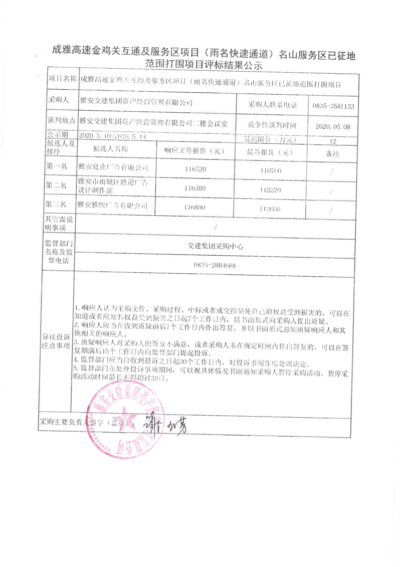 雅安交建集團(tuán)資產(chǎn)經(jīng)營(yíng)管理有限公司成雅高速金雞關(guān)互通及服務(wù)區(qū)項(xiàng)目(雨名快速通道)名山服務(wù)區(qū)已征地范圍打圍項(xiàng)目評(píng)標(biāo)結(jié)果公示