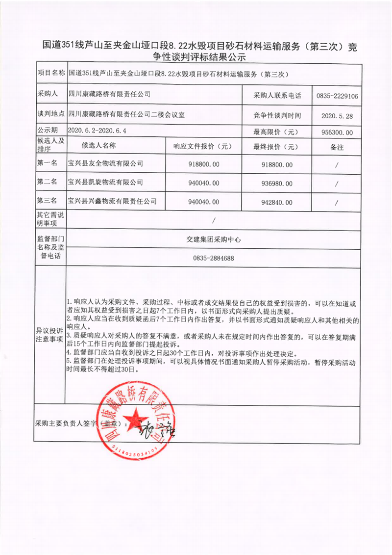 四川康藏路橋有限責(zé)任公司國道351線蘆山至夾金山埡口段8.22水毀項目砂石材料運(yùn)輸服務(wù)(第三次)競爭性談判評標(biāo)結(jié)果公示