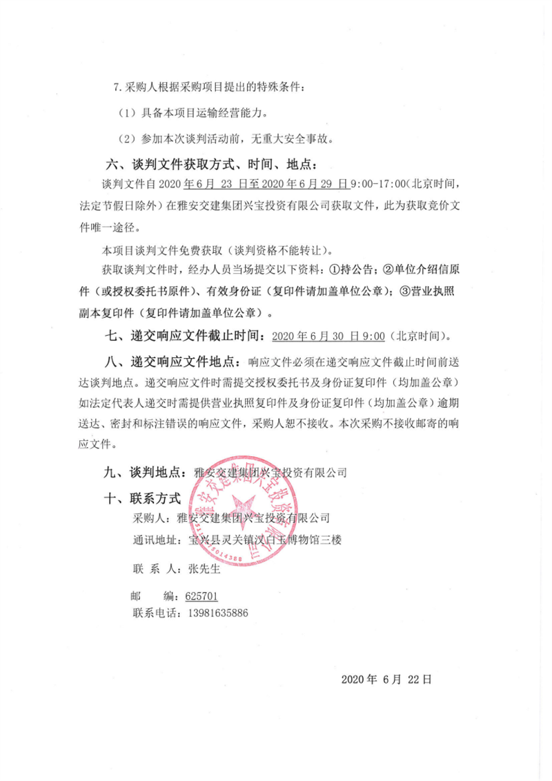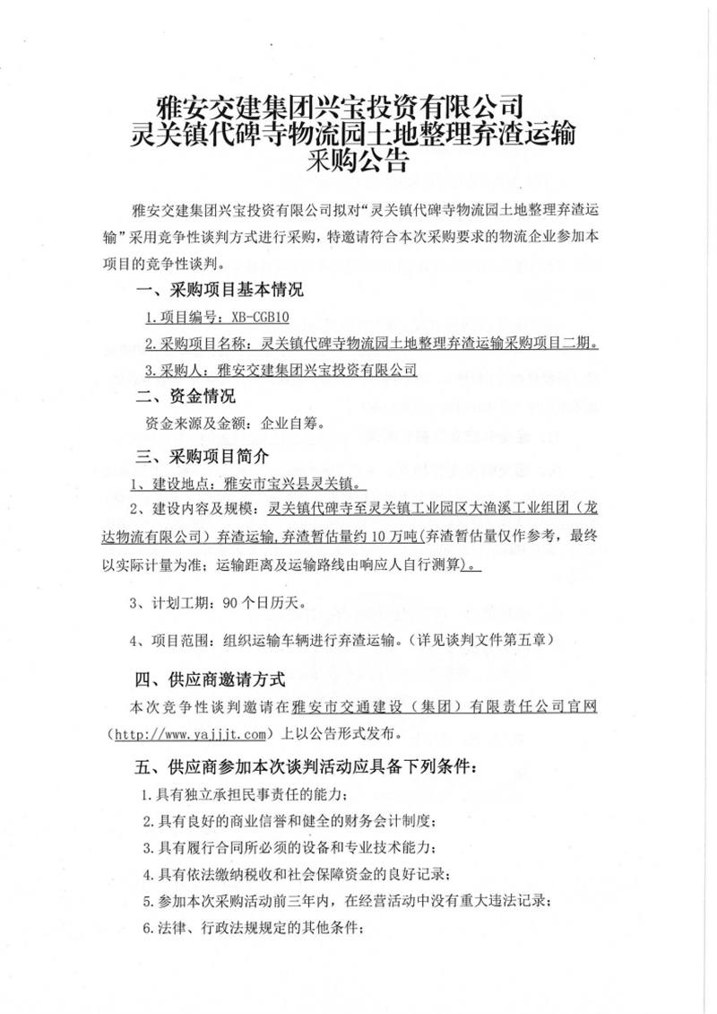 雅安交建集團(tuán)興寶投資有限公司靈關(guān)鎮(zhèn)代碑寺物流園土地整理?xiàng)壴\(yùn)輸采購(gòu)項(xiàng)目二期競(jìng)爭(zhēng)性談判公告