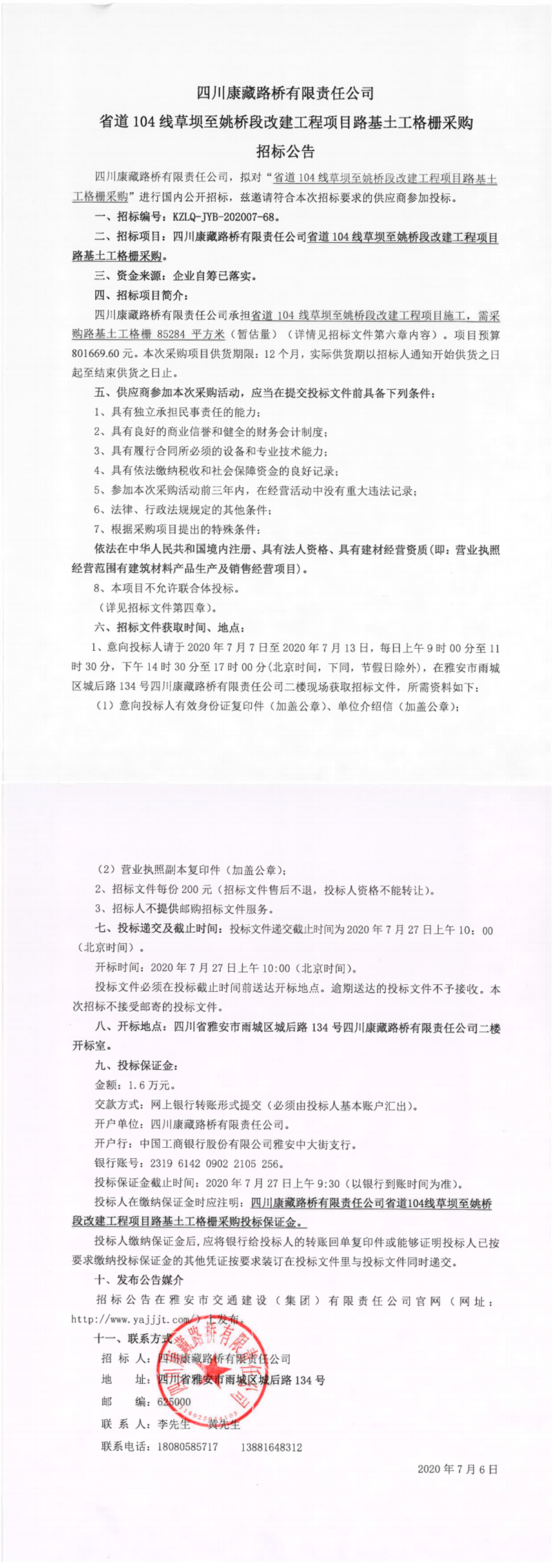 四川康藏路橋有限責任公司省道104線草壩至姚橋段改建工程項目路基土工格柵采購招標公告