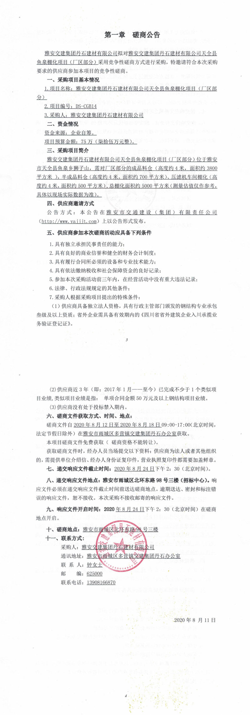 雅安交建集團(tuán)丹石建材有限公司天全縣魚泉棚化項(xiàng)目(廠區(qū)部分)競爭性磋商公告