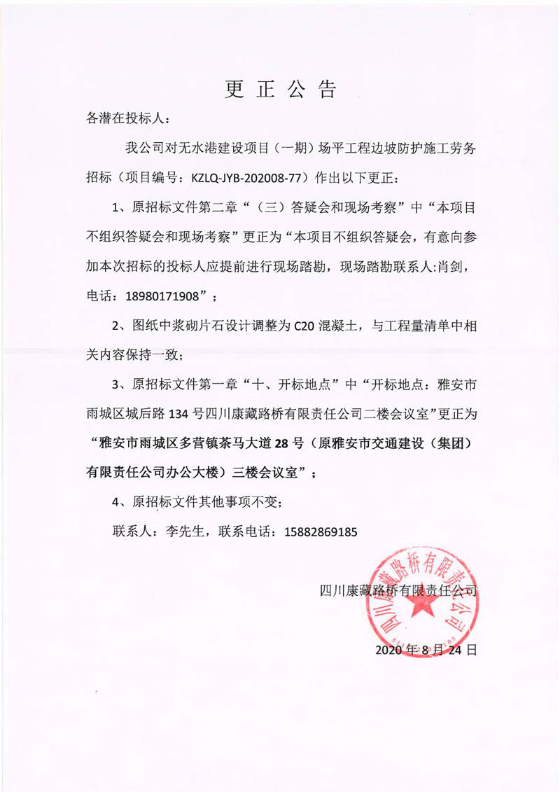 四川康藏路橋有限責(zé)任公司無(wú)水港建設(shè)項(xiàng)目(一期)場(chǎng)平工程邊坡防護(hù)施工勞務(wù)招標(biāo)更正公告