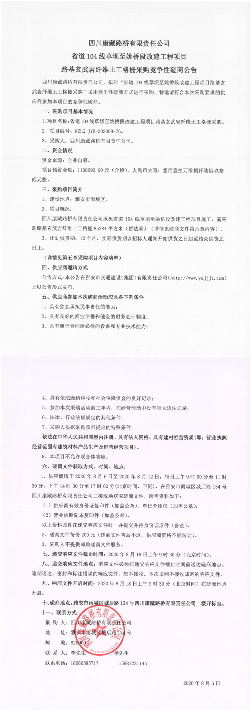 四川康藏路橋有限責(zé)任公司省道104線草壩至姚橋段改建工程項(xiàng)目路基玄武巖纖維土工格柵采購(gòu)競(jìng)爭(zhēng)性磋商公告