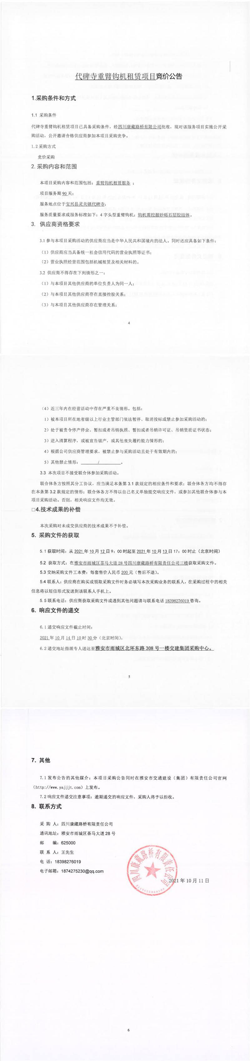 四川康藏路橋有限責任公司代碑寺重臂鉤機租賃項目競價公告