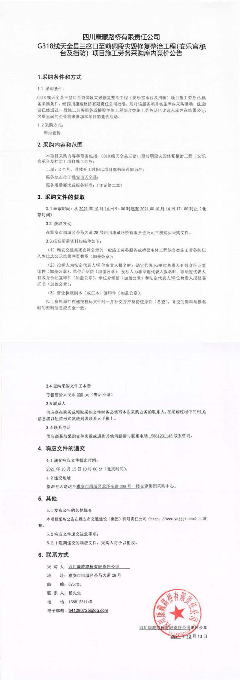 四川康藏路橋有限責(zé)任公司G318線天全縣三岔口至前碉段災(zāi)毀修復(fù)整治工程(安樂宮承臺及擋防)項(xiàng)目施工勞務(wù)采購庫內(nèi)競價公告