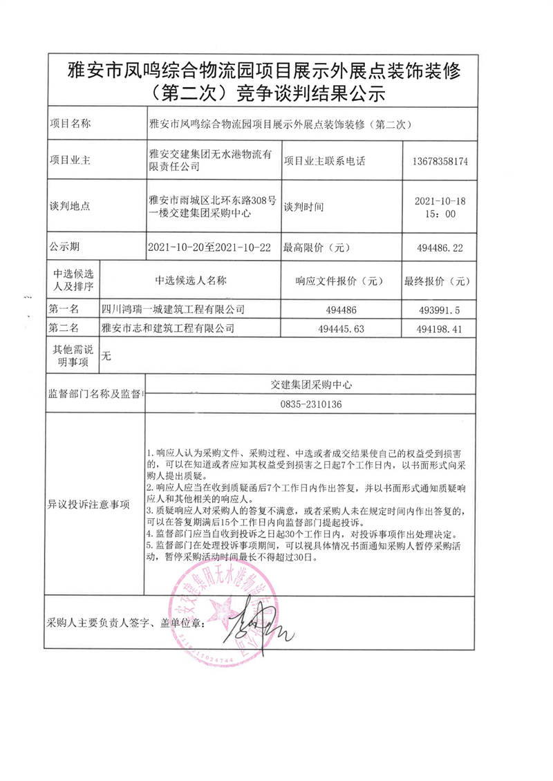 雅安交建集團(tuán)無水港物流有限責(zé)任公司雅安市鳳鳴綜合物流園項(xiàng)目展示外展點(diǎn)裝飾裝修(第二次)競(jìng)爭(zhēng)談判結(jié)果公示