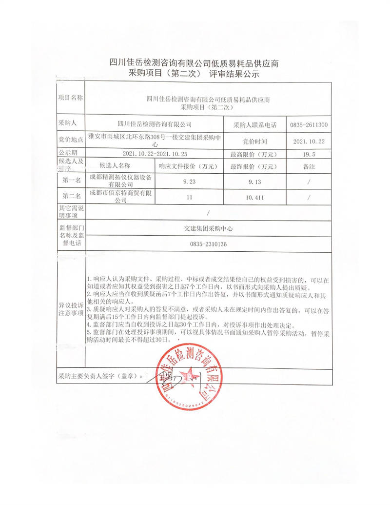 四川佳岳檢測咨詢有限公司低質(zhì)易耗品供應(yīng)商采購項目(第二次)評審結(jié)果公示