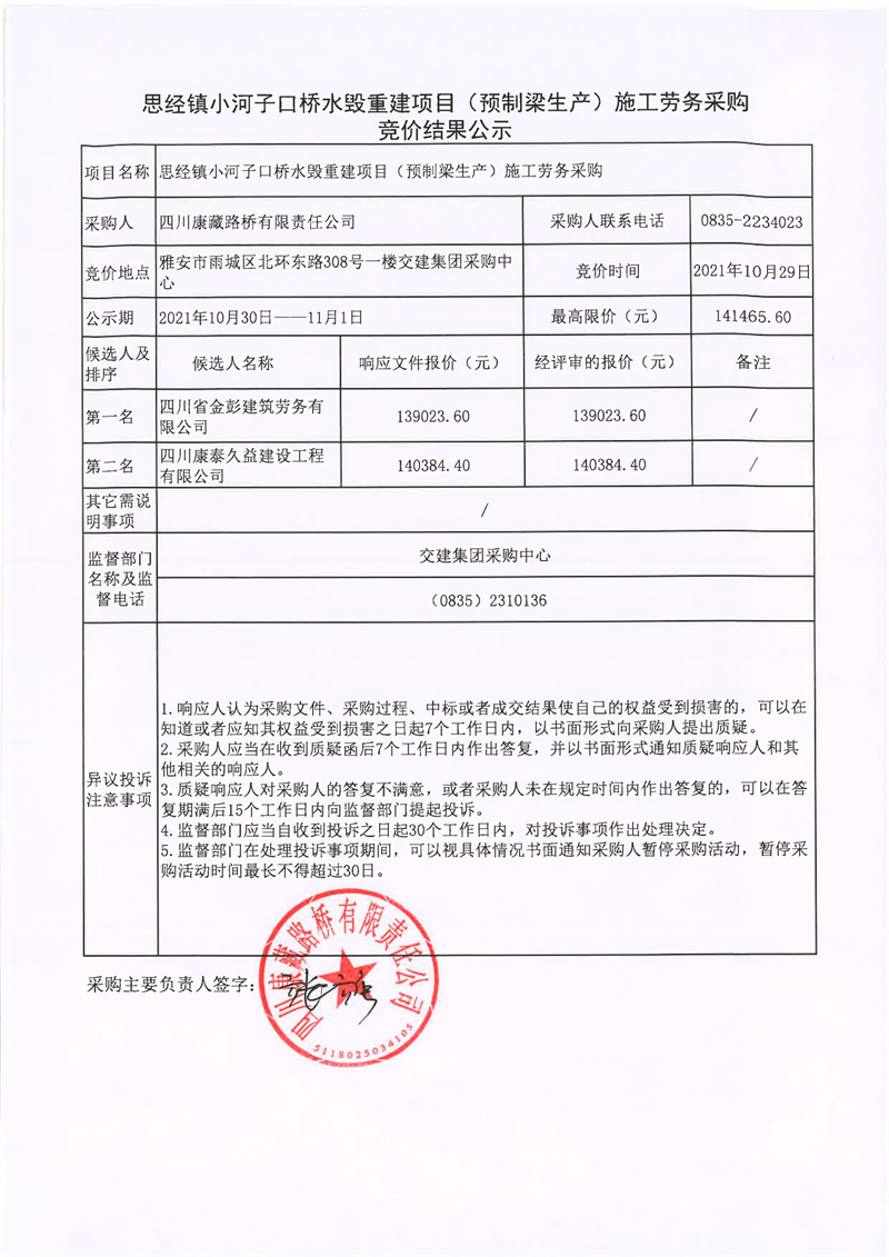 四川康藏路橋有限責任公司思經(jīng)鎮(zhèn)小河子口橋水毀重建項目(預制梁生產(chǎn))施工勞務(wù)采購競價結(jié)果公示