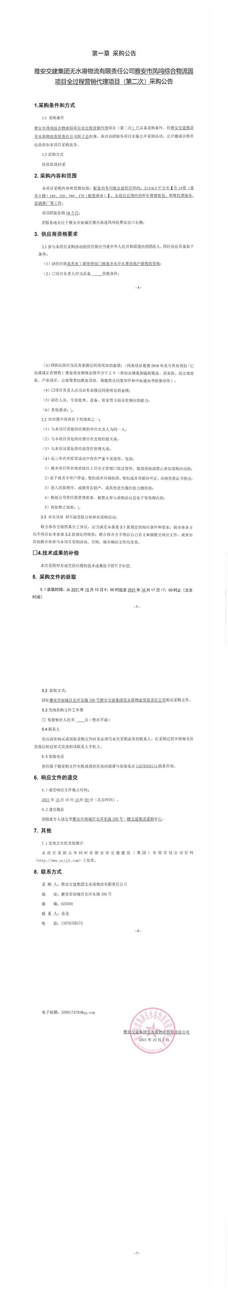 雅安交建集團(tuán)無(wú)水港物流有限責(zé)任公司雅安市鳳鳴綜合物流園項(xiàng)目全過(guò)程營(yíng)銷代理項(xiàng)目(第二次)采購(gòu)公告